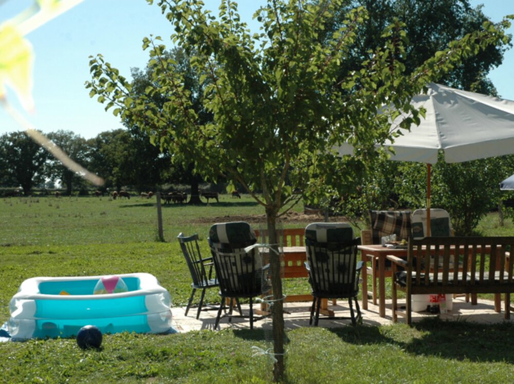 Buiten is er een heerlijk zitje met uitzicht over de weilanden.